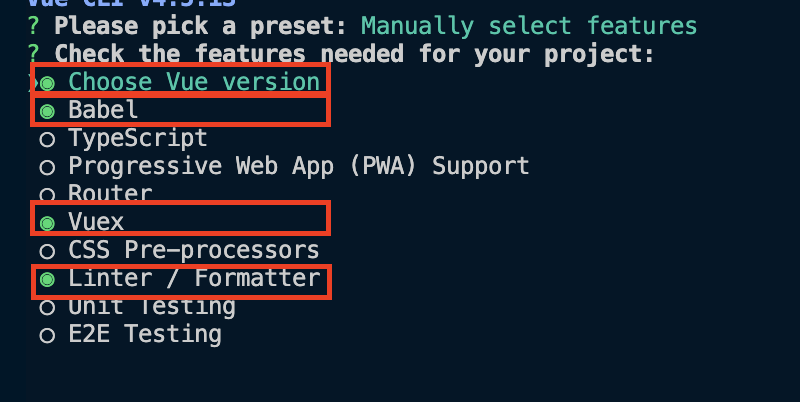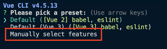 $ vue create vue-project-manually2. 이번에는 Manually select features를 선택합니다.