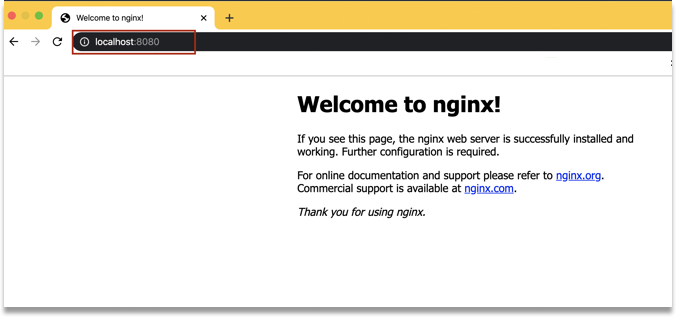 $ docker run --name nginx-server -d -p 8080:80 nginx Unable to find image 'nginx:latest' locally latest: Pulling from library/nginx 68ced04f60ab: Pull complete 28252775b295: Pull complete a616aa3b0bf2: Pull complete Digest: sha256:2539d4344dd18e1df02be842ffc435f8e1f699cfc55516e2cf2cb16b7a9aea0b Status: Downloaded newer image for nginx:latest 87781528d23655be1c12feb6a1f54a63f8e41696a370512e41462cd210288114- localhost:8080 접속하기