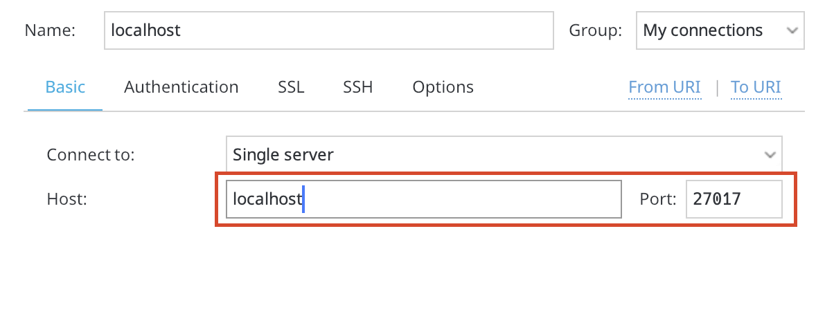 편하게 접속하기 위해 mongodb client tool를 다운로드하여서 docker mongo에 접속하 겠습니다. 원하는 mongodb client tool를 사용하여 아래와 같이 host: localhost, port: 27017로 하고 authentication에는 이전에 설정한 admin 계정을 넣어 줍니다.