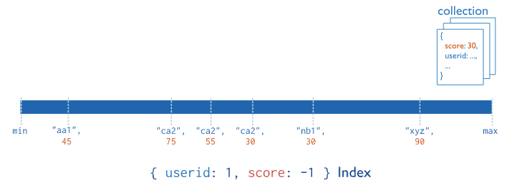 - 생성된 인덱스: { a: 1, b: -1 } - 지원하는 조회 쿼리: { a: 1, b: -1 } - 지원하는 조회 쿼리: { a: -1, b: 1 } - 지원하지 않는 조회 쿼리: { b: 1, a: 1 } - 지원하지 않는 조회 쿼리: { b: -1, a: -1 }아래 예제로 실습을 진행해 봅시다. 이전에 생성한 인덱스는 drop 하고 진행해 봅니다. {userid:1, score:-1} 인덱스를 생성합니다. 순서를 동일 시한 실행은 문제없이 실행됩니다. 반면 정렬 순서를 역으로 하지 않거나 순서를 다르게 한 경우는 정상 동작하지 않습니다.