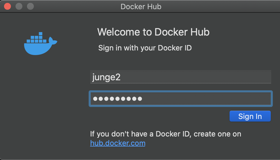 **$ sudo docker login** WARNING: Error loading config file: /Users/jungee/.docker/config.json: EOF Login with your Docker ID to push and pull images from Docker Hub. If you don't have a Docker ID, head over to https://hub.docker.com to create one. **Username: [내 hub ID] Password:** Login Succeeded- 방법 2. UI에서 로그인하기 (mac 환경)