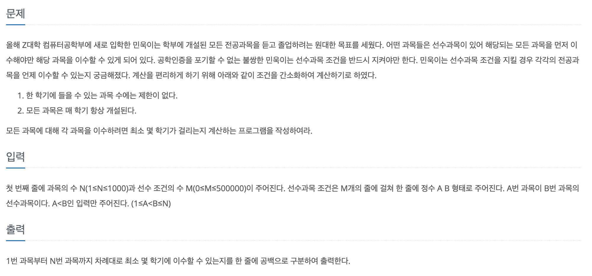 import sys from collections import deque def topology_sort(): q = deque() # 1. 진입차수가 0인 모든 노드를 큐에 넣는다. for i in range(n): if indegree[i] == 0: # 처음은 진입차수가 0인 것부터. 진입차수 0이 시작하는 노드이기 때문 q.append(i) # 2. 큐가 빌 때까지 아래 과정 반복한다. while q: # 2-1. 큐에서 원소를 꺼내 해당 노드에서 나가는 간선을 그래프에서 제거한다. now = q.popleft() for i in graph[now]: indegree[i] -= 1 if indegree[i] == 0: # 2-2. 새롭게 진입차수가 0이된 노드를 큐에 넣기 & 결과 넣기 result[i] = result[now] + 1 # [추가된 부분] 현재 노드 결과에 + 1한(다음 학기) 학기로 넣기 q.append(i) print(*result) n, m = map(int, sys.stdin.readline().split()) # 과목수, 선수 조건 수 indegree = [0] * n result = [1] * n graph = [[] for i in range(n)] for _ in range(m): a, b = map(int, sys.stdin.readline().split()) graph[a - 1].append(b - 1) # a > b indegree[b - 1] += 1 # 진입 차수 topology_sort()5. 결론