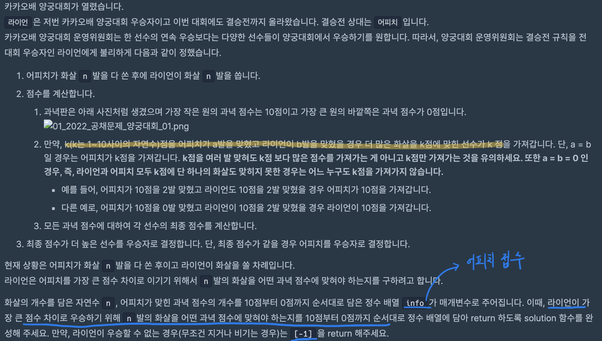 문제 설명 카카오배 양궁대회가 열렸습니다. 라이언은 저번 카카오배 양궁대회 우승자이고 이번 대회에도 결승전까지 올라왔습니다. 결승전 상대는 어피치입니다. 카카오배 양궁대회 운영위원