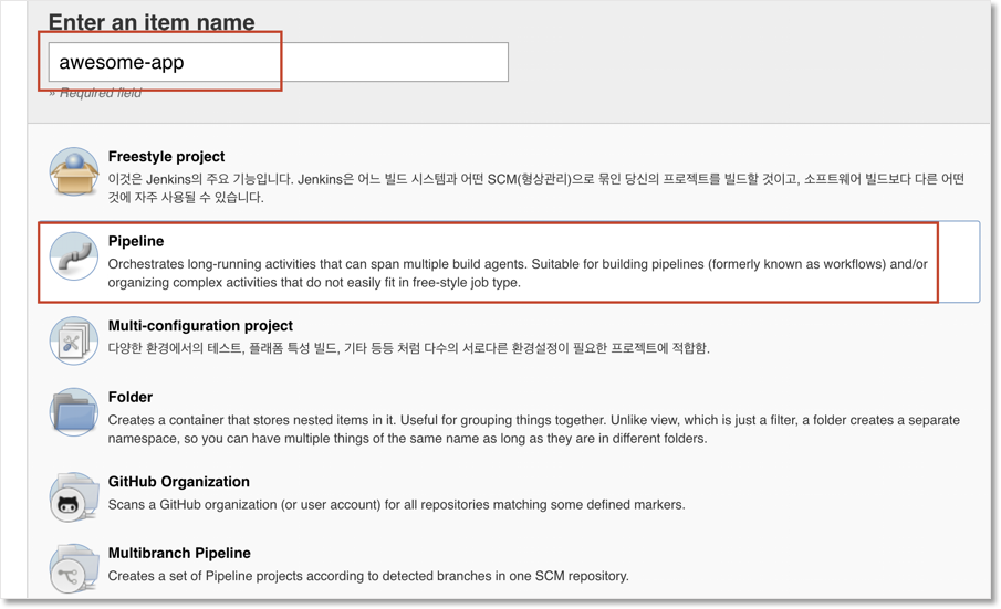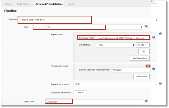 node { git poll: true, url:'https://github.com/JUNGEEYOU/jenkins_flask.git' withCredentials([[$class: 'UsernamePasswordMultiBinding', credentialsId: 'docker-hub', usernameVariable: 'DOCKER_USER_ID', passwordVariable: 'DOCKER_USER_PASSWORD']]) { stage('Pull') { git 'https://github.com/JUNGEEYOU/jenkins_flask.git' } stage('Unit Test') { } stage('Build') { sh(script: 'docker-compose build app') } stage('Tag') { sh(script: '''docker tag ${DOCKER_USER_ID}/flask \ ${DOCKER_USER_ID}/flask:${BUILD_NUMBER}''') } stage('Push') { sh(script: 'docker login -u ${DOCKER_USER_ID} -p ${DOCKER_USER_PASSWORD}') sh(script: 'docker push ${DOCKER_USER_ID}/flask:${BUILD_NUMBER}') sh(script: 'docker push ${DOCKER_USER_ID}/flask:latest') } stage('Deploy') { sh(script: 'docker-compose up -d production') } } }2. "구성"에 들어가 Pipline 부분으로 이동