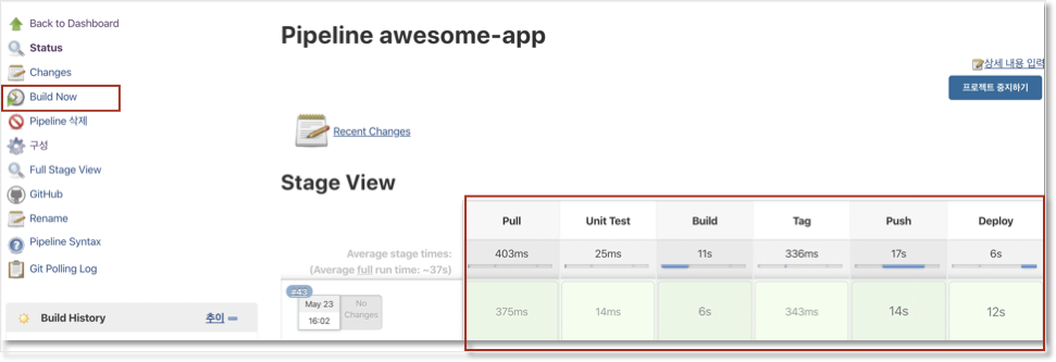 "build now"를 클릭하여 배포가 자동으로 되는지 확인합니다. 오른쪽 stage view를 보며 문제가 없는지 log도 확인합니다.
