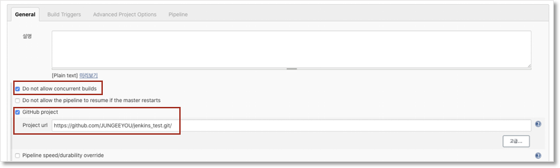 Do not allow concurrent builds 체크: 한 빌드가 진행 중이면 연속적인 빌드를 진행하지 않도록 합니다.