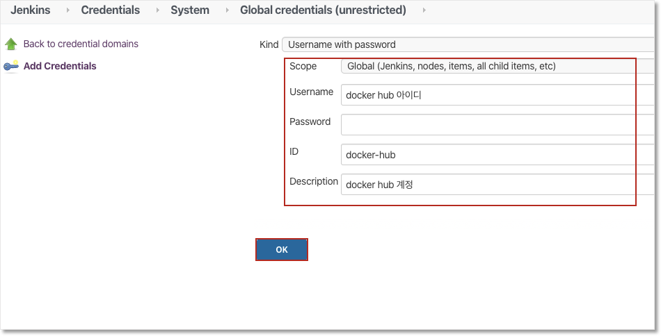 docker hub 접속을 위해 Credentials 먼저 생성합니다.