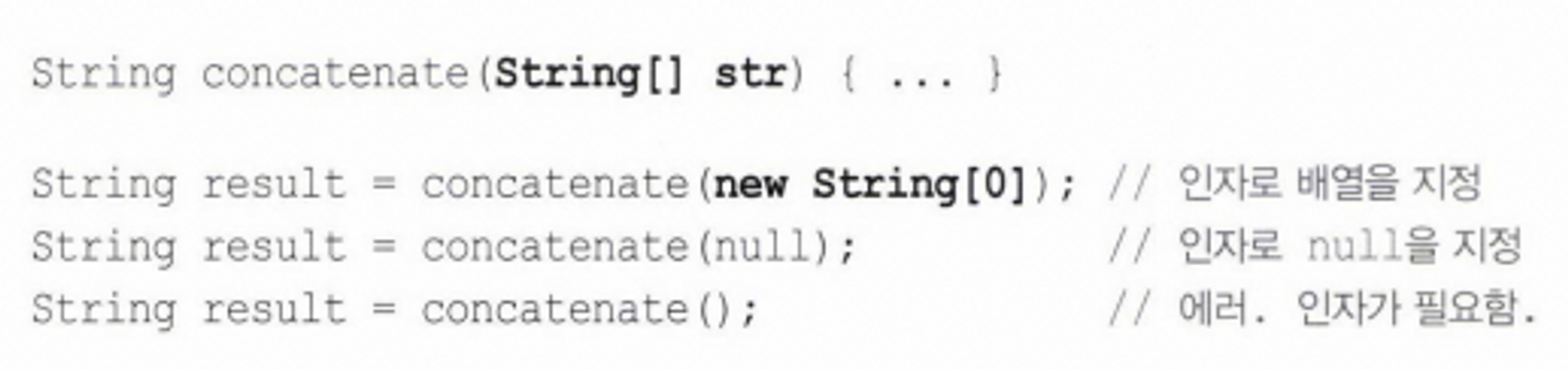 아래 예시를 보면 concatenate 메서드를 오버로딩했다. delim이 없는 경우를 오버로딩하였지만, 실제 컴퓨터는 이 두 메서드를 구분할 수 없기 때문에 에러가 발생한다. 따라서 가변인자 메서드는 오버로딩하지 않는 것을 추천한다.