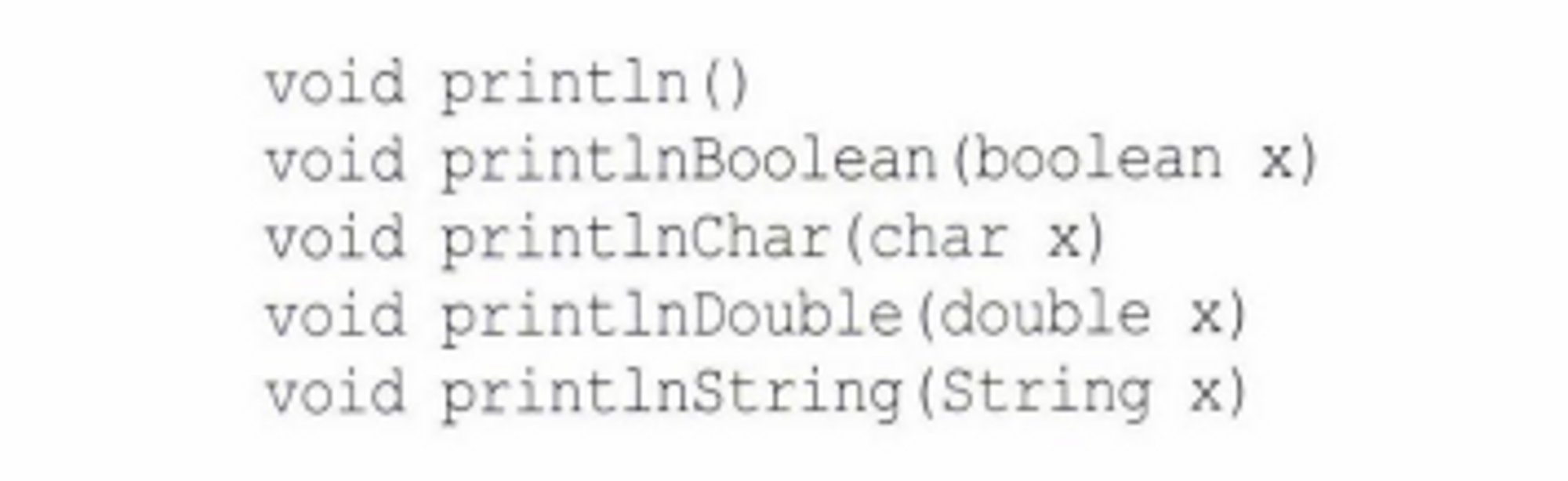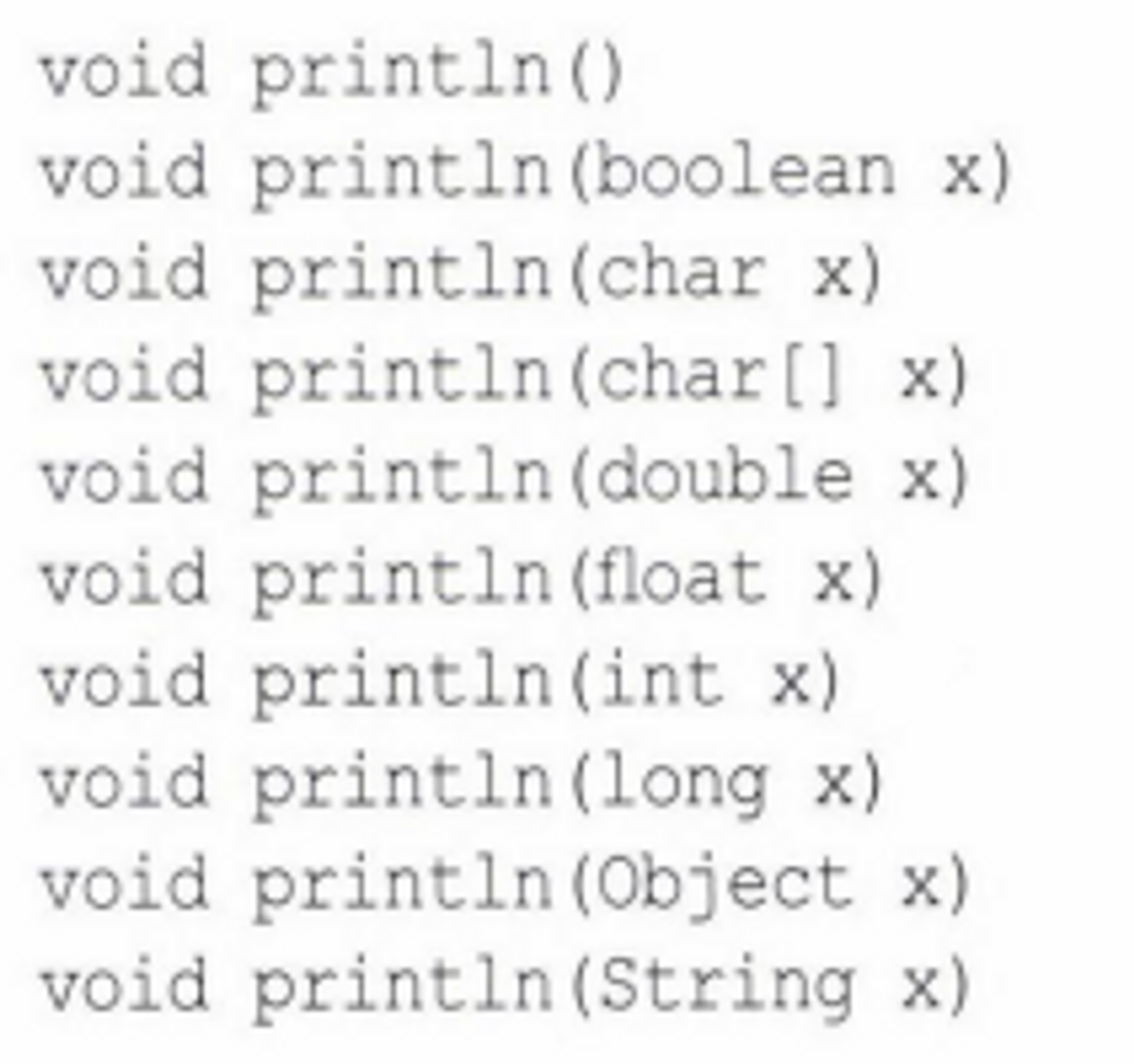 가장 대표적인 것은 println 메서드이다. 아래와 같이 매개변수 타입에 따라서 오버로딩 되어 있다.