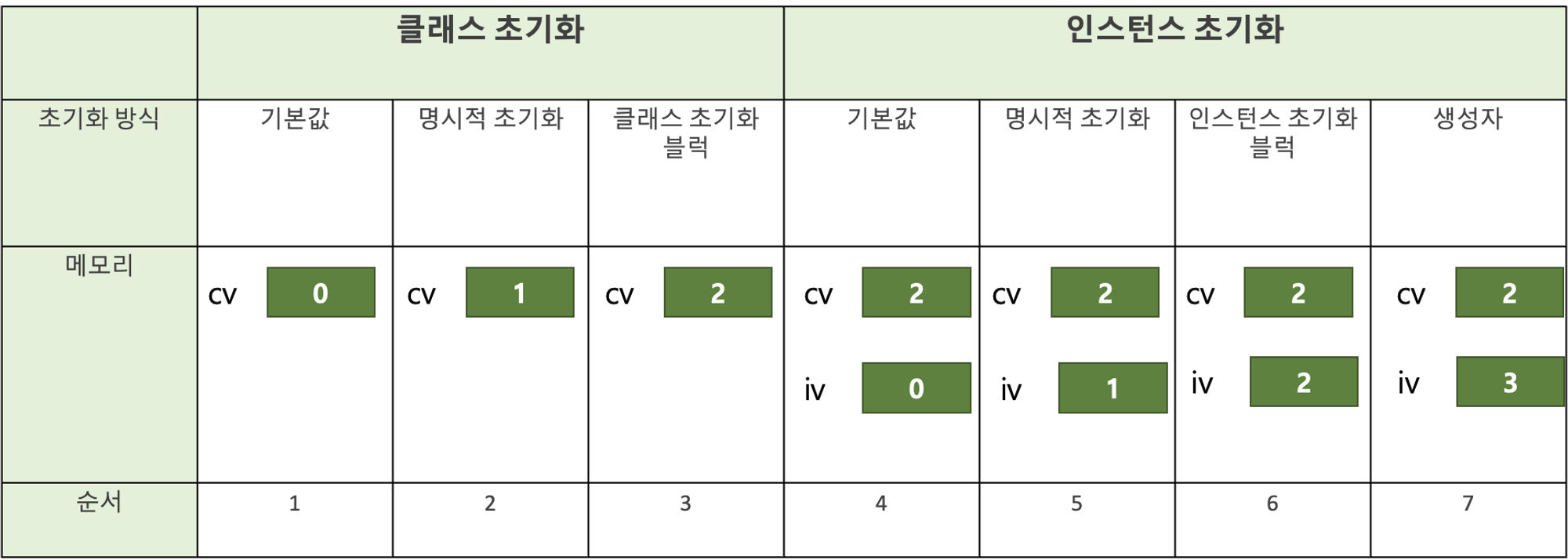 class InitTest { // 명시적 초기화 (간단 초기화) static int cv = 1; int iv = 1; static {cv = 2;} // 클래스 초기화 블럭 {iv = 2;} // 인스턴스 초기화 블럭 InitTest() { // 생성자 iv = 3; } }위 예시의 순서는 아래와 같이 이뤄진다.