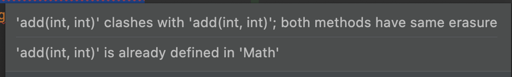 아래 add() 메서드에서 리턴값만 다른 경우 아래와 같은 에러가 발생한다. 이는 오버로딩이 아니다!!