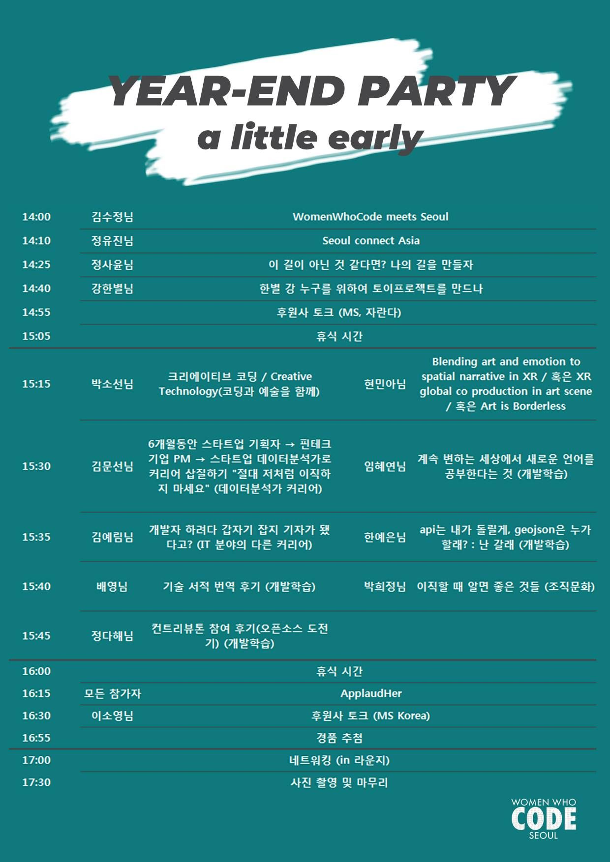 https://www.facebook.com/groups/wwcodeseoul/ 페이스북에 가입을 하다가 연말 파티를 한다고 하여 참석하게 되었습니다. 일정은 아래와 같았고, 저는 오른쪽에 있는 B세션을 들었습니다. 😃 제가 들으면서 괜찮았던 부분만 간단히 요약해봤습니다~