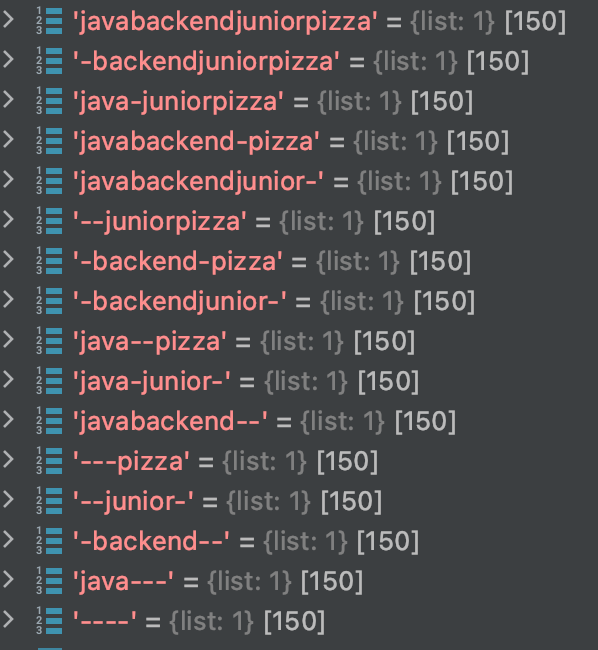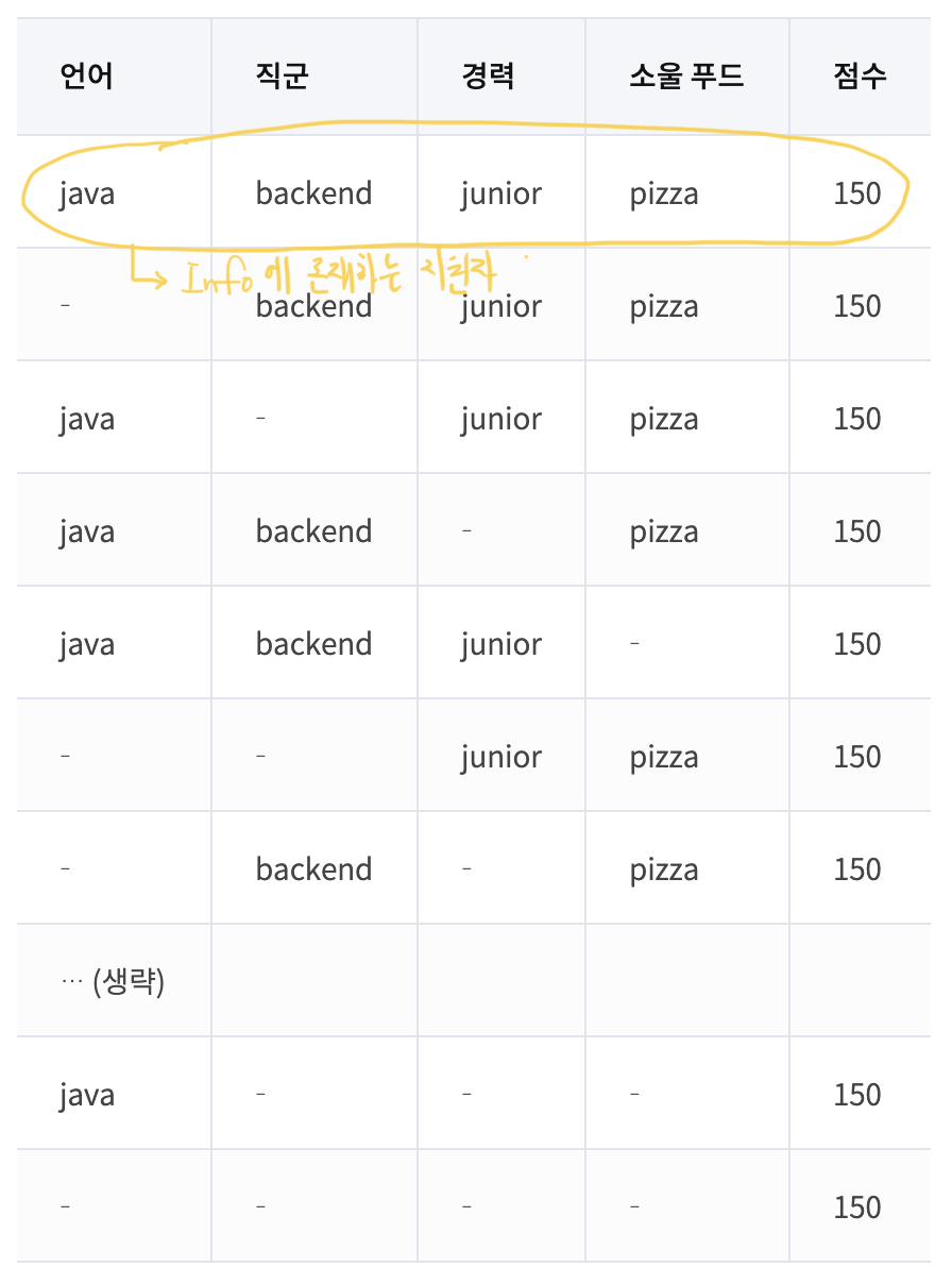 - ex) java backend junior pizza 150 인 지원자의 경우 아래 표와 같이 생성이 된다.