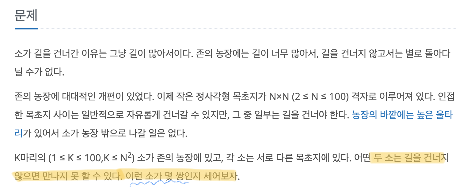 - 예제 문제를 그려보면 아래와 같다. 소의 위치와 길의 위치가 주어지고, 두 소가 쌍을 지어 서로 길 없이 만날 수 있는지 확인을 해야 한다.