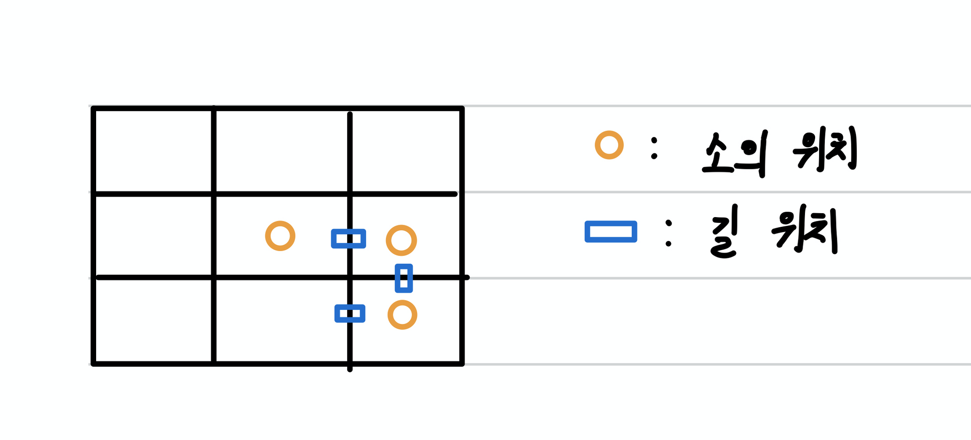 - 예제 문제를 그려보면 아래와 같다. 소의 위치와 길의 위치가 주어지고, 두 소가 쌍을 지어 서로 길 없이 만날 수 있는지 확인을 해야 한다.