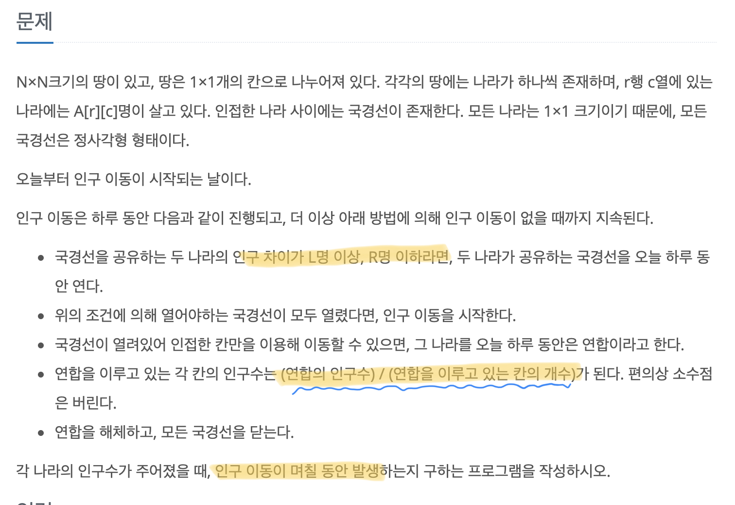 - 인접 국가를 탐색하면서 인구 차이 l명 이상, r명 이하인 경우 연합 진행