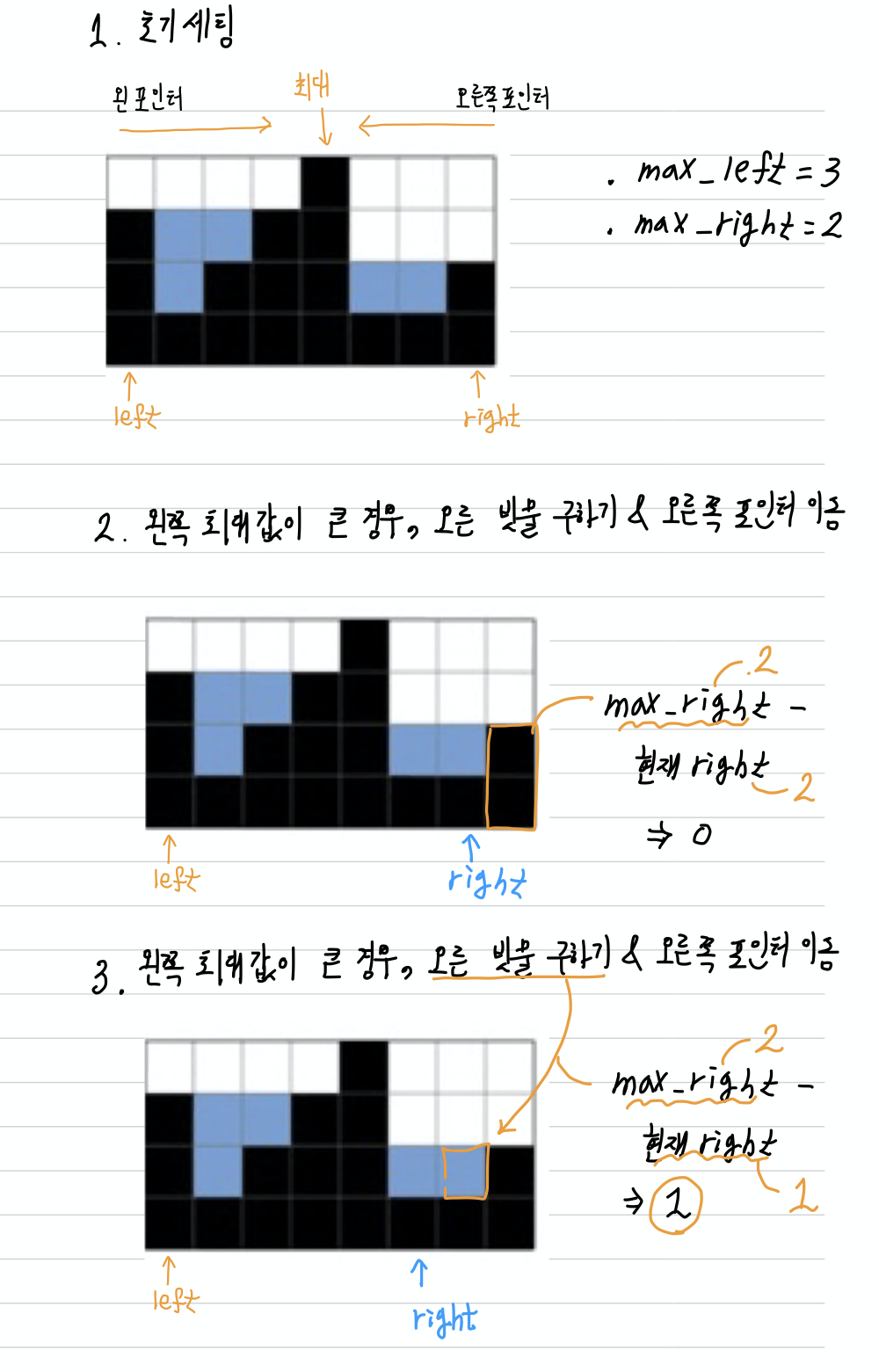 - 왼쪽 포인터 최대값이 큰 경우, 오른쪽 빗물 구하기 & 오른쪽 이동