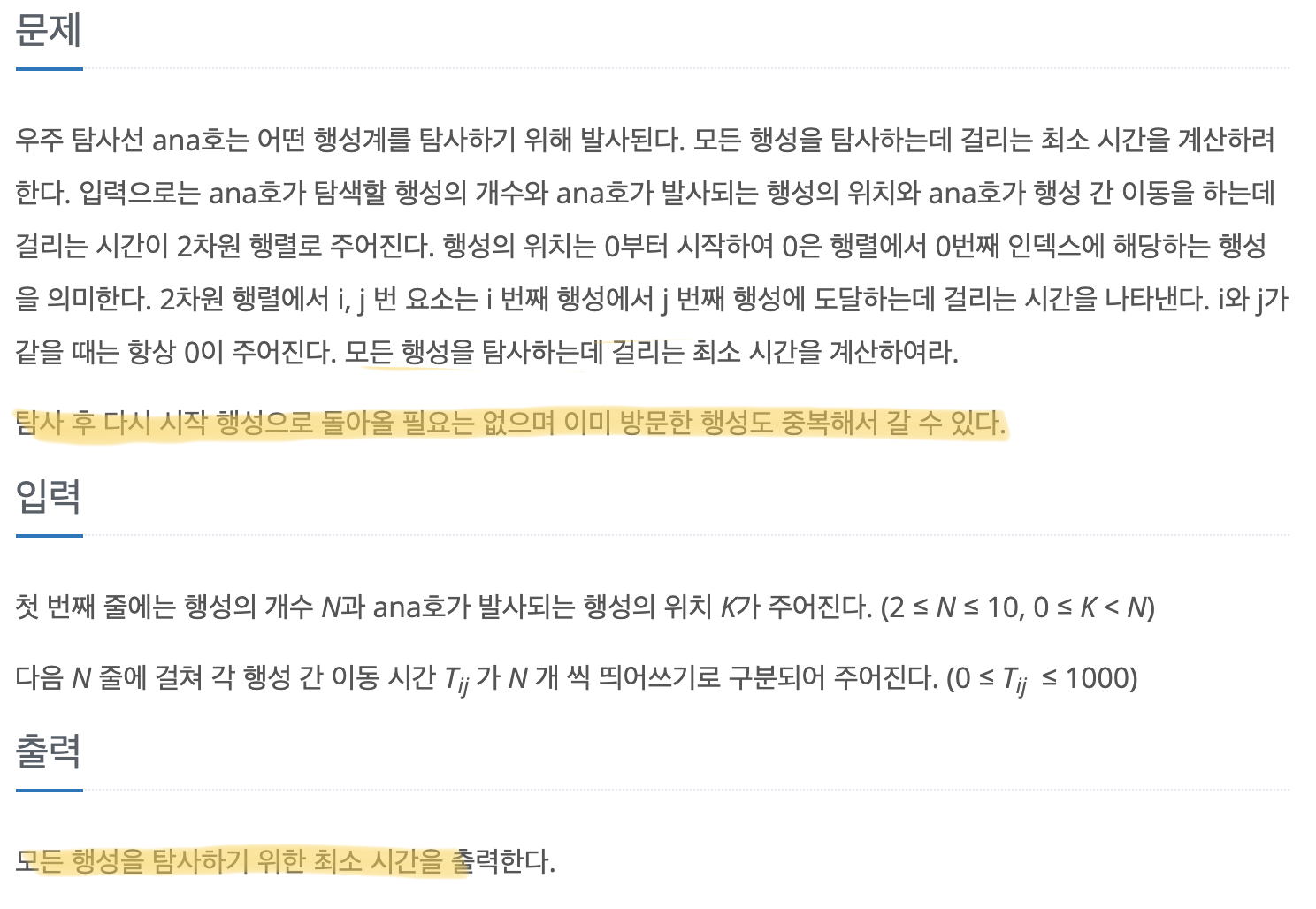 우주 탐사선 ana호는 어떤 행성계를 탐사하기 위해 발사된다. 모든 행성을 탐사하는데 걸리는 최소 시간을 계산하려 한다. 입력으로는 ana호가 탐색할 행성의 개수와 ana호가 발사되는 행성의 위