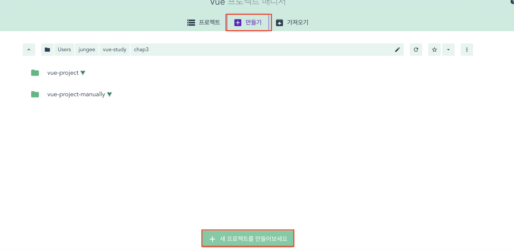 대부분 Vue 프로젝트를 생성할 때는 프로젝트 매니저를 사용하지 않고 직접 터미널 명령어 방식을 이용합니다. 해당 GUI 방식은 참고만 하면 될 것 같습니다.