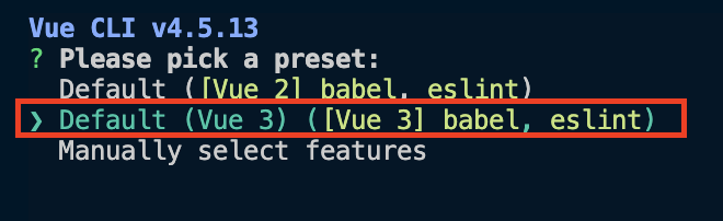 $ vue create vue-project아래 그림과 같이 Default (Vue 3) 옵션을 선택해 줍니다.