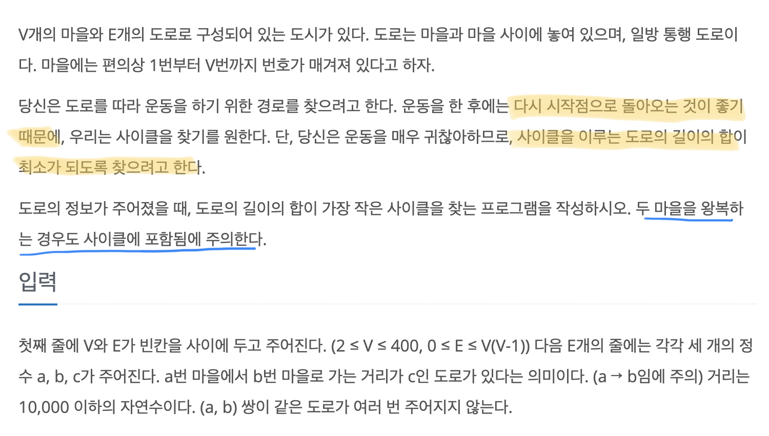 - 자기 자신 -> 자기 자신 마을로 돌아오는 거리 중 최솟값 구하기