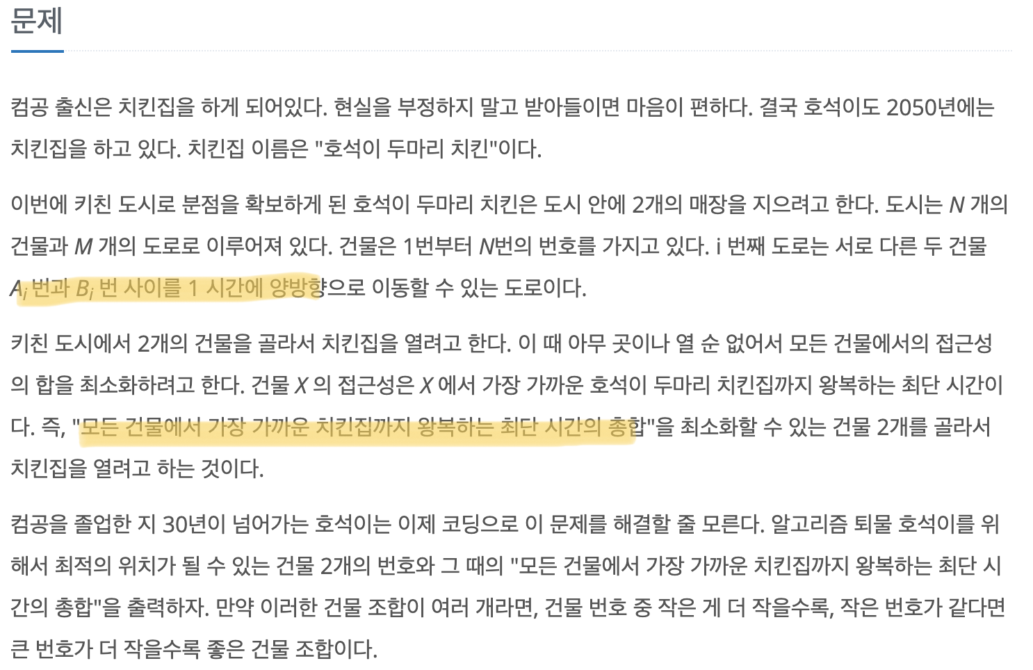 위의 그림과 같이 1번과 2번 건물에 치킨집을 짓게 되면 1번부터 5번 건물에 대해 치킨집까지의 왕복 시간이 0, 0, 2, 2, 2 로 최소가 된다. 2번과 3번 건물에 지어도 동일한 왕복 시간이 나오지만 더