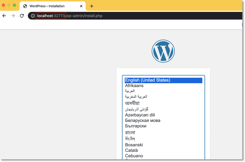 $ docker ps CONTAINER ID IMAGE COMMAND CREATED STATUS PORTS NAMES 699c2553b0c6 wordpress "docker-entrypoint.s…" 11 minutes ago Up 10 minutes 0.0.0.0:32773->80/tcp wordpress e74707db71cc mysql:5.7 "docker-entrypoint.s…" 11 minutes ago Up 11 minutes 3306/tcp, 33060/tcp wordpressdb- localhost:[해당 포트]에 접속