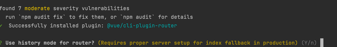 vue add routerhistory mode는 URL의 해쉬 값 제거 속성으로 사용 여부 y(사용)를 사용하는 경우 url 경로가 #이 아닌 / 로 변경된다.