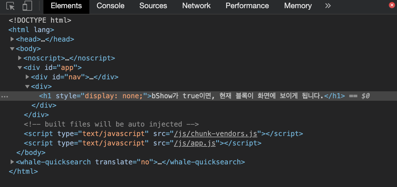 <template> <div> <h1 v-show="bShow">bShow가 true이면, 현재 블록이 화면에 보이게 됩니다.</h1> </div> </template> <script> export default { data() { return { bShow: false }; } } </script>