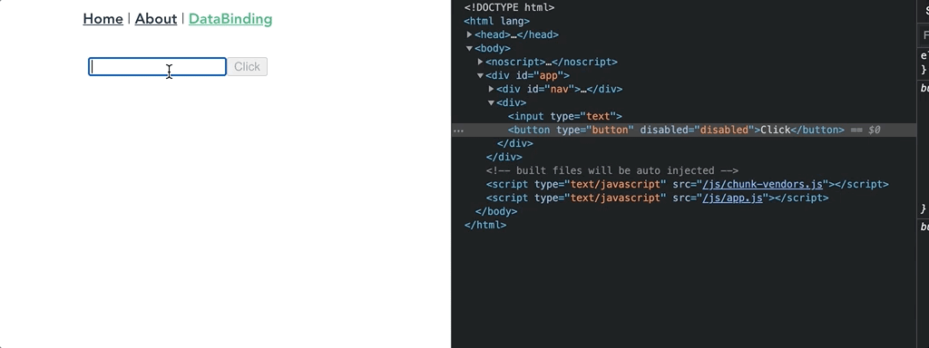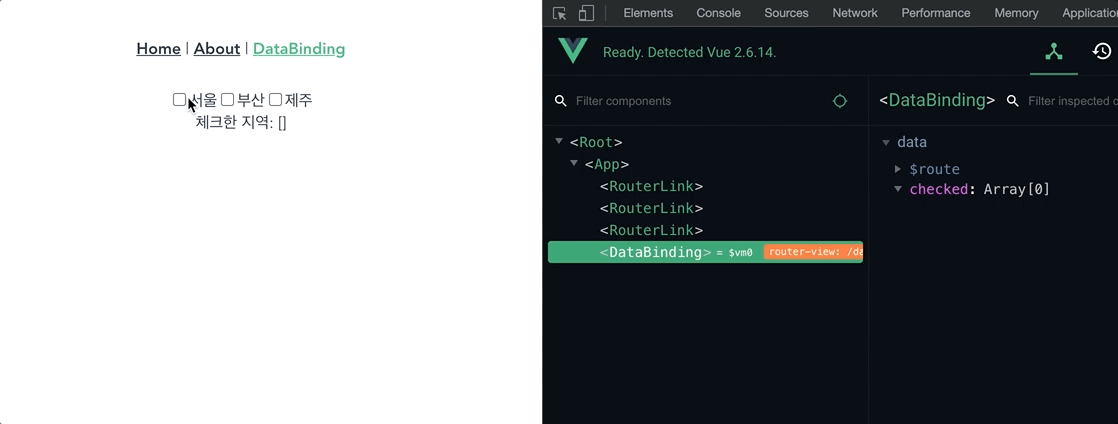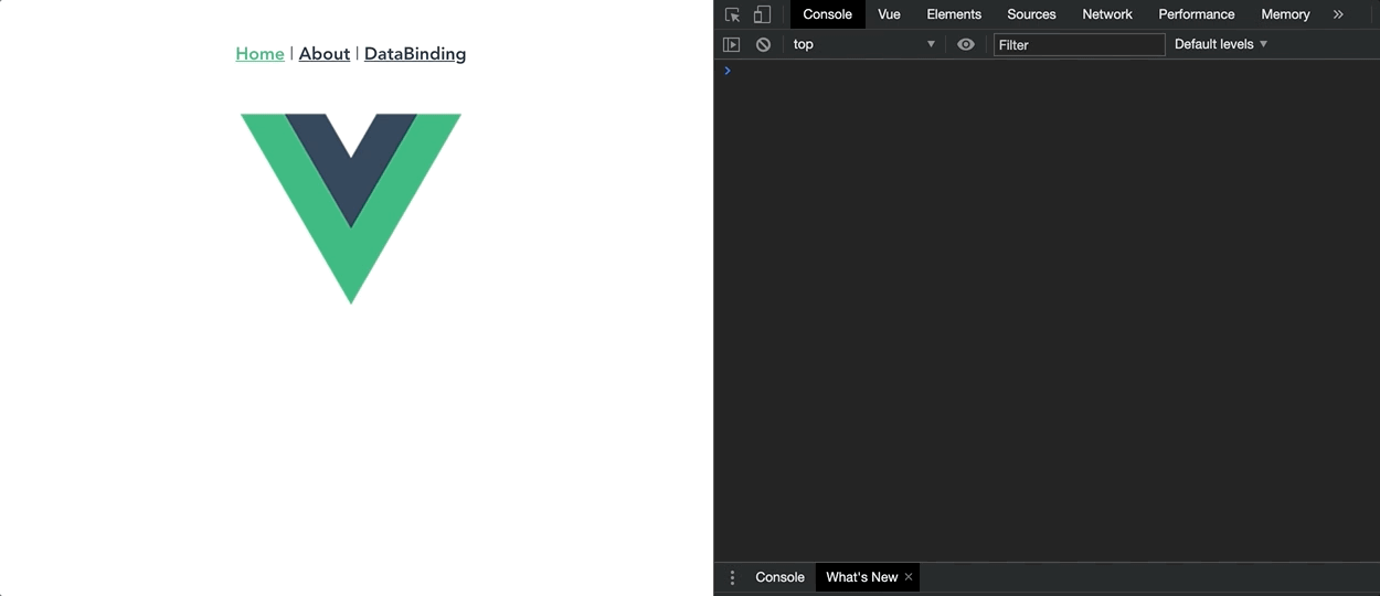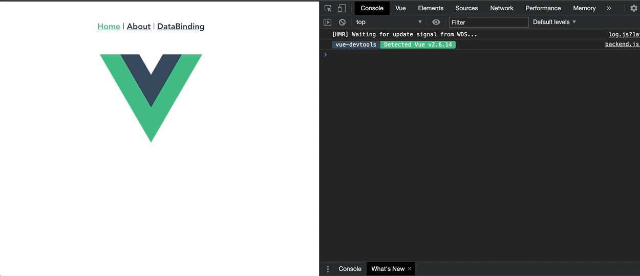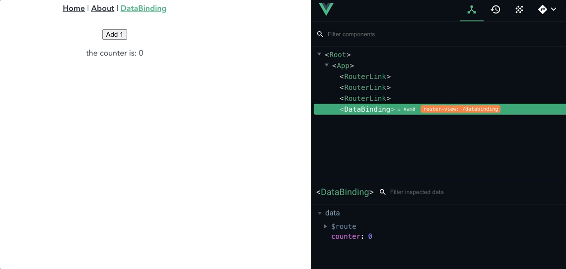 import Vue from 'vue' import VueRouter from 'vue-router' import Home from '../views/Home.vue' import DataBinding from '../views/DataBinding.vue' Vue.use(VueRouter) const routes = [ ... 생략 { path: '/databinding', name: 'DataBinding', component: DataBinding }, ]- src/App.vue