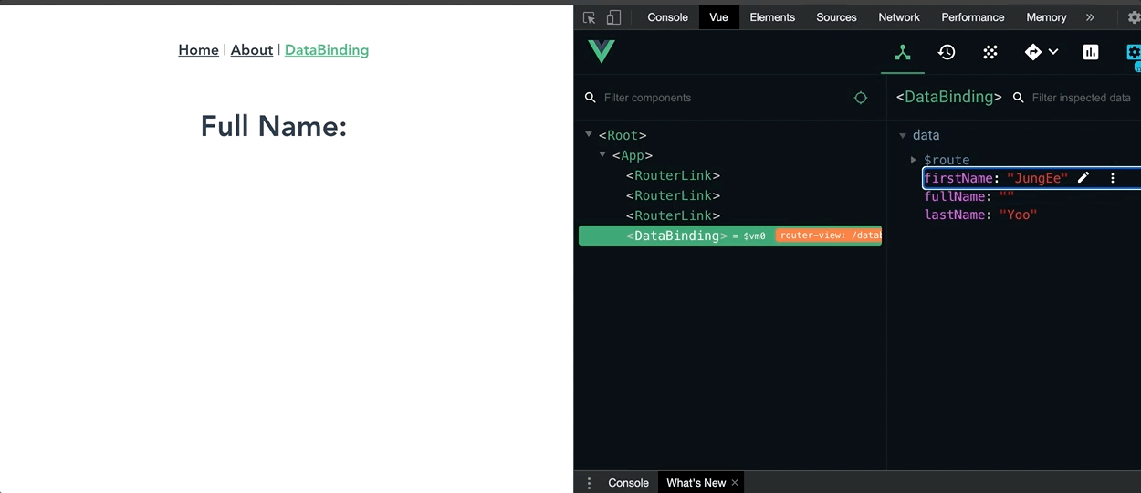 <template> <div> <h1>Full Name: {{fullName}}</h1> </div> </template> <script> export default { data(){ return { firstName : "JungEe", lastName : "Yoo", fullName: '' }; }, watch: { firstName() { console.log("watch- firstName"); this.fullName = this.firstName + ' ' + this.lastName; }, lastName() { console.log("watch - lastName"); this.fullName = this.firstName + ' ' + this.lastName; } } } </script>아래와 같이 값을 변경해야 watch에 존재하는 로그가 출력되는 것을 확인할 수 있습니다.