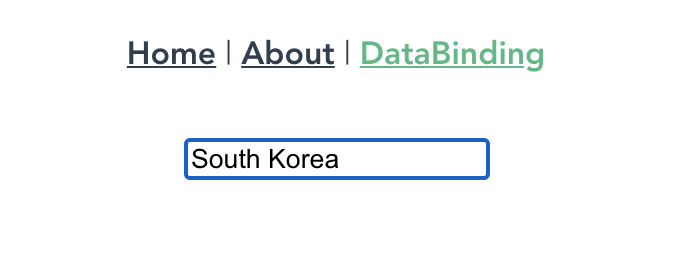 <template> <div> <input type="text" v-model="valueModel"> </div> </template> <script> export default { data() { return { valueModel: 'South Korea' }; } } </script> <style> </style>Input type=text 객체의 value에 valueModel 값인 'South Korea'에 바인딩되어서 화면에 나타납니다.