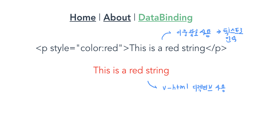 HTML 태그를 바인딩할 때는 문자열 바인딩할 때 사용한 이중 중괄호를 이용하면 안 됩니다.