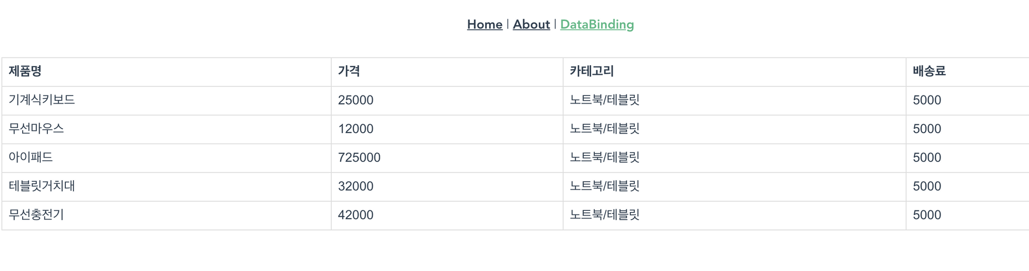 <template> <div> <table> <thead> <tr> <th>제품명</th> <th>가격</th> <th>카테고리</th> <th>배송료</th> </tr> </thead> <tbody> <tr :key="i" v-for="(product,i) in productList"> <td>{{product.product_name}}</td> <td>{{product.price}}</td> <td>{{product.category}}</td> <td>{{product.delivery_price}}</td> </tr> </tbody> </table> </div> </template> <script> export default { data() { return { productList: [ { "product_name": "기계식키보드", "price": 25000, "category": "노트북/테블릿", "delivery_price": 5000}, { "product_name": "무선마우스", "price": 12000, "category": "노트북/테블릿", "delivery_price": 5000}, { "product_name": "아이패드", "price": 725000, "category": "노트북/테블릿", "delivery_price": 5000}, { "product_name": "테블릿거치대", "price": 32000, "category": "노트북/테블릿", "delivery_price": 5000}, { "product_name": "무선충전기", "price": 42000, "category": "노트북/테블릿", "delivery_price": 5000}, ] }; } } </script> <style scoped> table { font-family: arial, sans-serif; border-collapse: collapse; width: 100% } td, th { border: 1px solid #dddddd; text-align: left; padding: 8px; } </style>