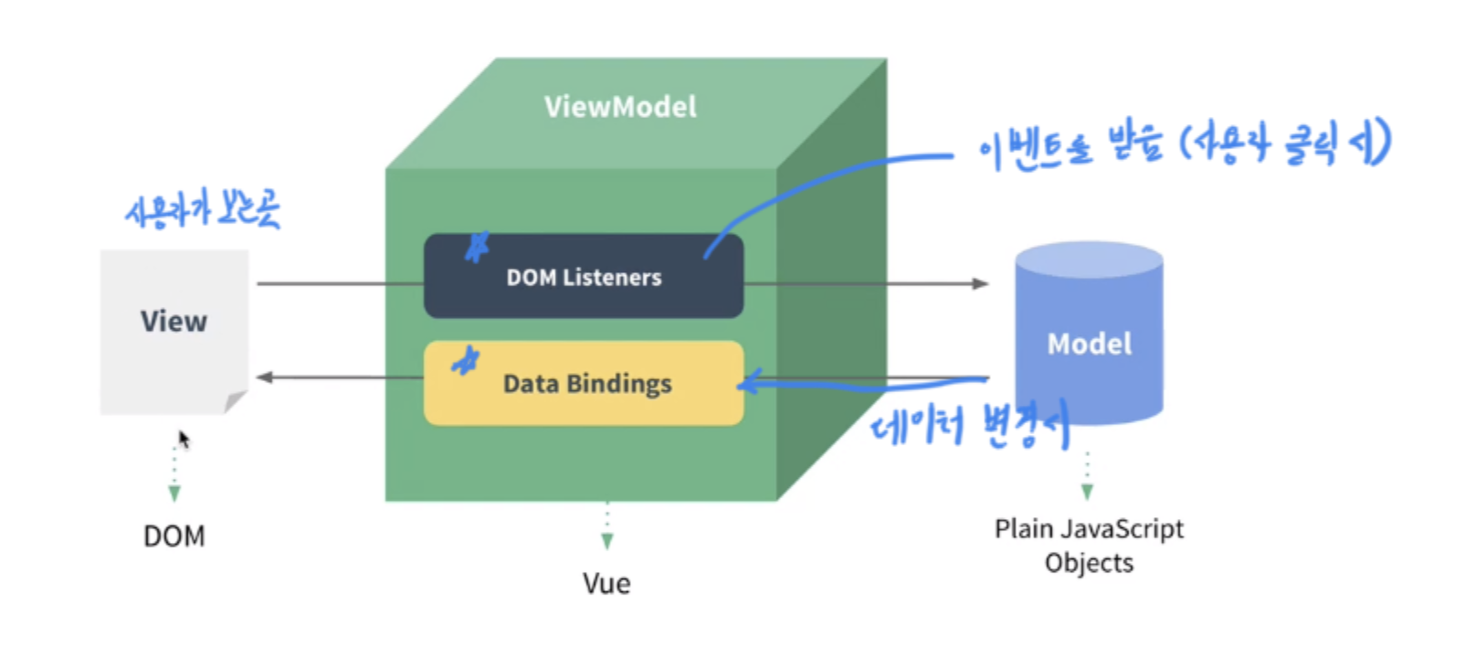 - 뷰 모델(Vue): 뷰와 모델의 중간 영역으로 돔 리스너와 데이터 바인딩을 제공