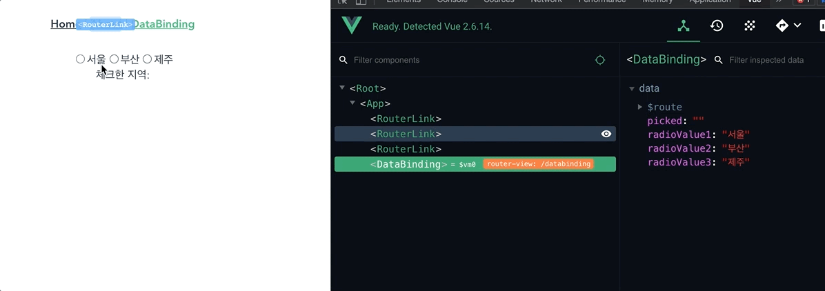 라디오 역시 체크박스와 동일하게 v-model은 내부적으로 checked 속성과 바인딩이 이뤄집니다. value 바인딩을 하고 싶다면 v-model이 아닌 v-bind:value을 사용해야 합니다.