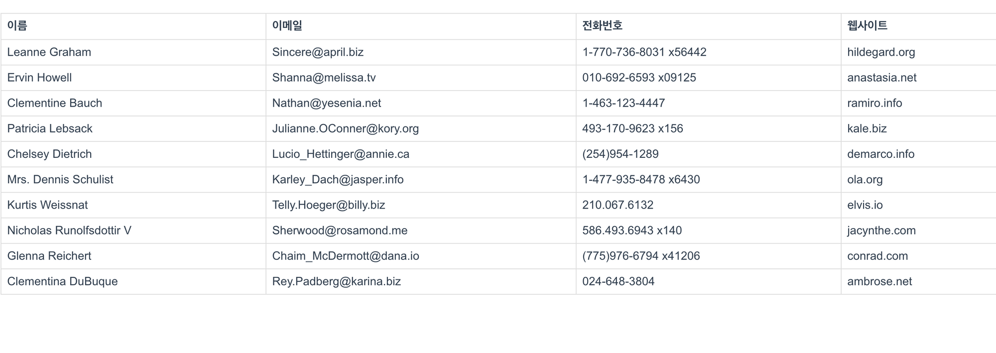 <template> <div> <table> <thead> <tr> <th>이름</th> <th>이메일</th> <th>전화번호</th> <th>웹사이트</th> </tr> </thead> <tbody> <tr :key="i" v-for="(user,i) in userList"> <td>{{user.name}}</td> <td>{{user.email}}</td> <td>{{user.phone}}</td> <td>{{user.website}}</td> </tr> </tbody> </table> </div> </template> <script> import axios from "axios"; export default { data() { return { userList: [ ] }; }, created() { this.getList(); }, methods: { getList: function() { var vm = this; axios.get('https://jsonplaceholder.typicode.com/users/') .then(function(response) { vm.userList = response.data; }) .catch(function(error) { console.log(error); }); } } } </script> <style scoped> table { font-family: arial, sans-serif; border-collapse: collapse; width: 100% } td, th { border: 1px solid #dddddd; text-align: left; padding: 8px; } </style>위 코드를 실행하면 아래와 같은 테이블을 확인할 수 있습니다.
