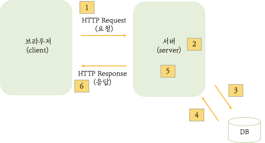 아래 그림을 살펴봅시다. 가장 처음으로 Client가 http 요청을 날립니다. 그다음 서버에서 백엔드 처리를 진행합니다. 3번에서 백엔드 로직 처리 중 db에 접근을 해서 4번에서 db 결과를 얻습니다. 5번에서 다시 4번에서 얻은 db 결과를 백엔드에서 처리합니다. 마지막으로 http 응답을 client에서 보냅니다.