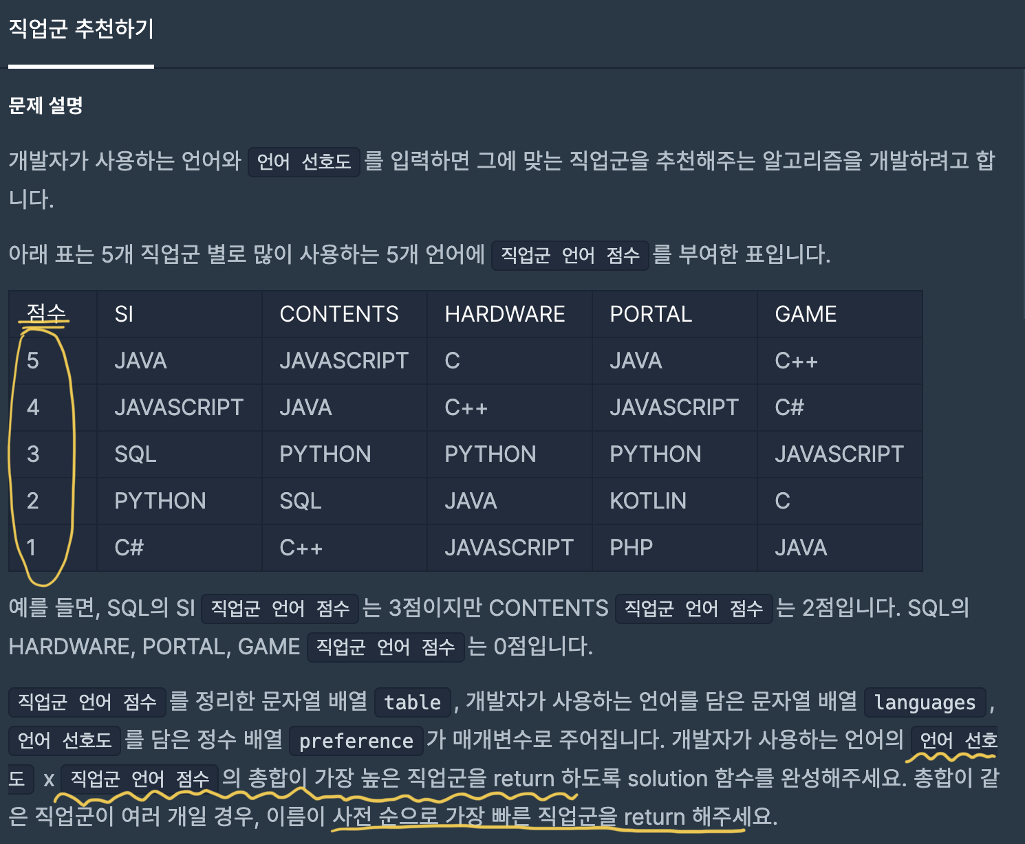 개발자가 사용하는 언어와 언어 선호도를 입력하면 그에 맞는 직업군을 추천해주는 알고리즘을 개발하려고 합니다. 아래 표는 5개 직업군 별로 많이 사용하는 5개 언어에 직업군 언어 점수를 부