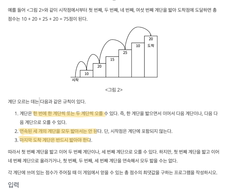 계단 오르기 게임은 계단 아래 시작점부터 계단 꼭대기에 위치한 도착점까지 가는 게임이다. <그림 1>과 같이 각각의 계단에는 일정한 점수가 쓰여 있는데 계단을 밟으면 그 계단에 쓰여 있는 점
