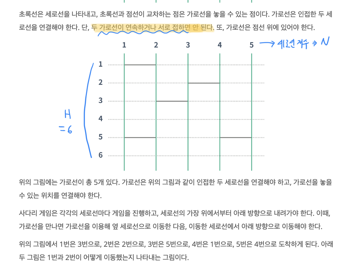 사다리 게임은 N개의 세로선과 M개의 가로선으로 이루어져 있다. 인접한 세로선 사이에는 가로선을 놓을 수 있는데, 각각의 세로선마다 가로선을 놓을 수 있는 위치의 개수는 H이고, 모든 세로선