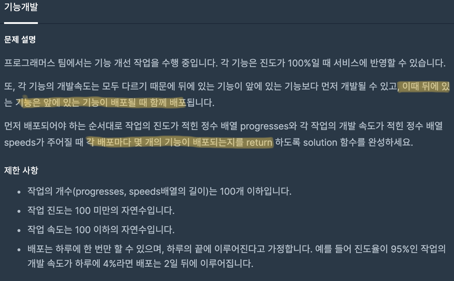 프로그래머스 팀에서는 기능 개선 작업을 수행 중입니다. 각 기능은 진도가 100%일 때 서비스에 반영할 수 있습니다. 또, 각 기능의 개발속도는 모두 다르기 때문에 뒤에 있는 기능이 앞에 있는