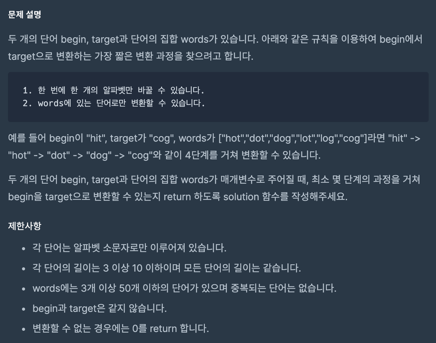 두 개의 단어 begin, target과 단어의 집합 words가 있습니다. 아래와 같은 규칙을 이용하여 begin에서 target으로 변환하는 가장 짧은 변환 과정을 찾으려고 합니다. 1. 한 번에 한 개의 알파벳만 바꿀 수