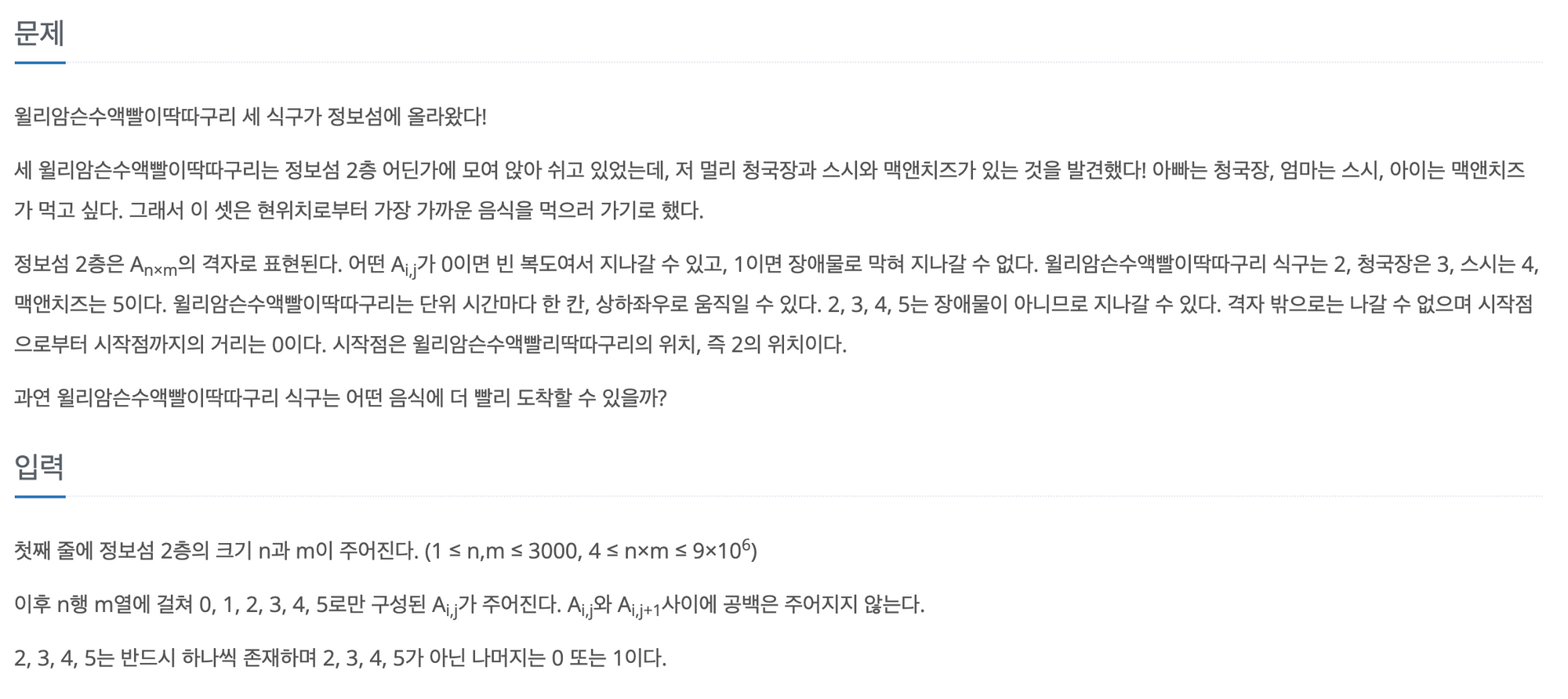 첫째 줄에 정보섬 2층의 크기 n과 m이 주어진다. (1 ≤ n,m ≤ 3000, 4 ≤ n×m ≤ 9×106) 이후 n행 m열에 걸쳐 0, 1, 2, 3, 4, 5로만 구성된 Ai,j가 주어진다. Ai,j와 Ai,j+1사이에 공백은 주어지지 않는다. 2,