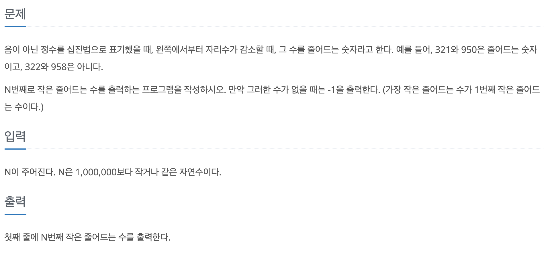 음이 아닌 정수를 십진법으로 표기했을 때, 왼쪽에서부터 자리수가 감소할 때, 그 수를 줄어드는 숫자라고 한다. 예를 들어, 321와 950은 줄어드는 숫자이고, 322와 958은 아니다. N번째로 작은 줄어