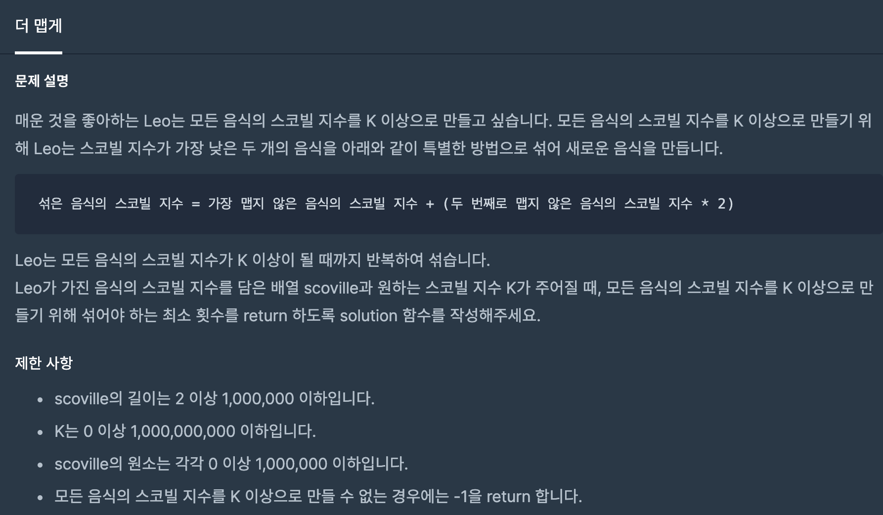 매운 것을 좋아하는 Leo는 모든 음식의 스코빌 지수를 K 이상으로 만들고 싶습니다. 모든 음식의 스코빌 지수를 K 이상으로 만들기 위해 Leo는 스코빌 지수가 가장 낮은 두 개의 음식을 아래와 같