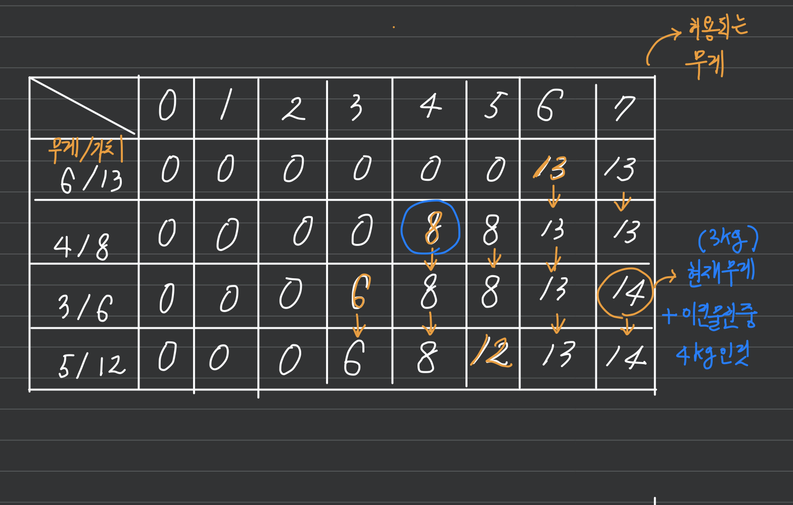dp[i][j] = max(현재 물건 가치 + dp[이전 물건][현재 가방 무게 - 현재 물건 무게], dp[이전 물건][현재 가방 무게])예시를 표로 만들어 보면 아래와 같다.