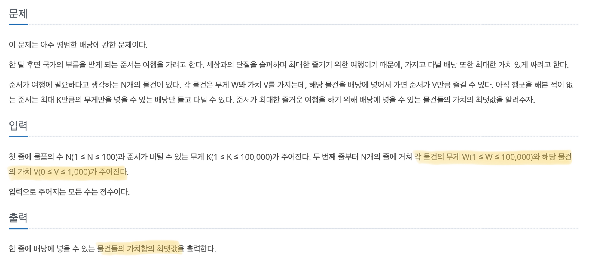 한 도둑이 훔치는 배낭에 담을 수 있는 무게의 최댓값이 정해져 있고, 일정 가치와 무게가 있는 짐들을 배낭에 넣을 때, 가치의 합이 최대가 되도록 짐을 고르는 방법을 찾는 문제이다.