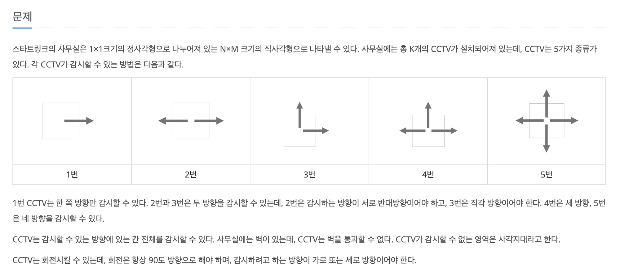 스타트링크의 사무실은 1×1크기의 정사각형으로 나누어져 있는 N×M 크기의 직사각형으로 나타낼 수 있다. 사무실에는 총 K개의 CCTV가 설치되어져 있는데, CCTV는 5가지 종류가 있다. 각 CCTV가 감