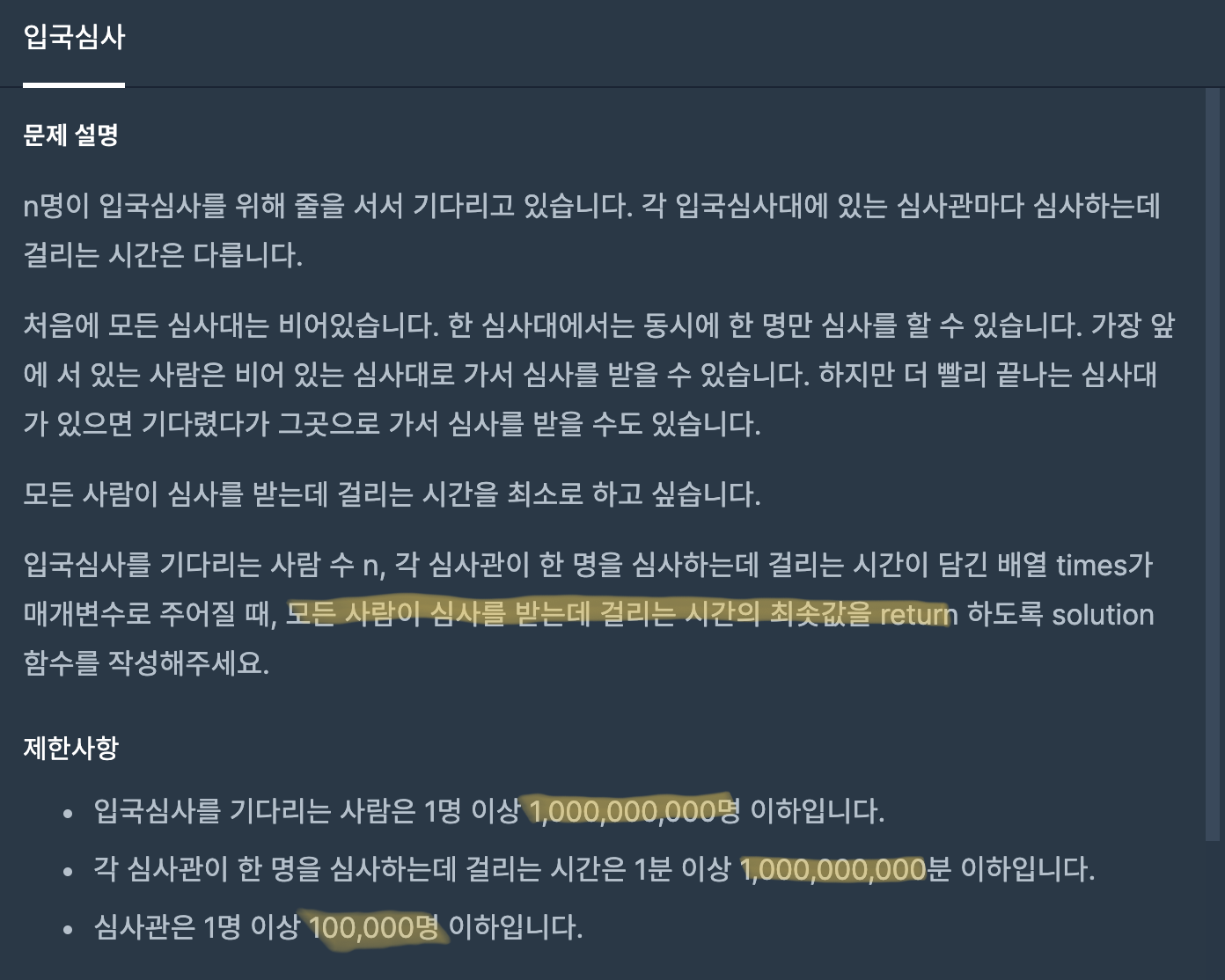 n명이 입국심사를 위해 줄을 서서 기다리고 있습니다. 각 입국심사대에 있는 심사관마다 심사하는데 걸리는 시간은 다릅니다. 처음에 모든 심사대는 비어있습니다. 한 심사대에서는 동시에 한